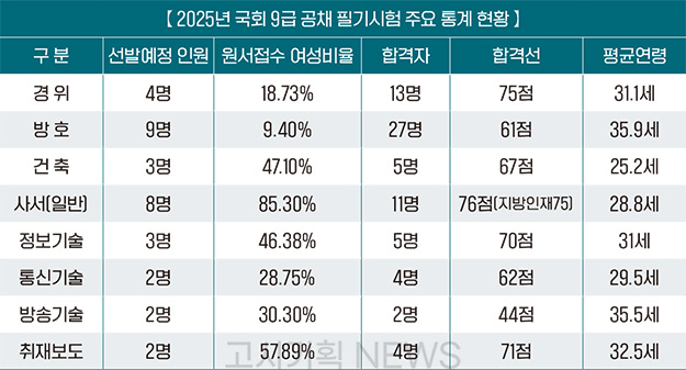 ±¹È¸»ç¹«Ã³´Â 2025³âµµ 9±Þ °ø°³°æÀïä¿ë½ÃÇè Çʱ⠰ü·Ã Åë°èÀڷḦ °ø°íÇß´Ù.À̹ø ½ÃÇè¿¡¼ ±¹È¸´Â ÃÑ 35¸íÀ» ¼±¹ßÇϱâ·Î Çß´Ù.¿ø¼Á¢¼ö °á°ú 1õ538¸íÀÌ Áö¿øÇØ 43.9´ë 1ÀÇ °æÀï·üÀ» ¹ßÇ¥Çß´Ù.°¡Àå ³ôÀº 78.3´ë 1ÀÇ °æÀï·üÀ» ±â·ÏÇÑ Á¤º¸±â¼úÀº 3¸í ¼±¹ß¿¡ 235¸íÀÌ Áö¿øÇÑ °ÍÀ¸·Î Áý°èµÆ´Ù.Á¢¼ö ¼ººñ¸¦ »ìÆìº¸¸é ¿©¼ººñÀ²ÀÌ °¡Àå ³ôÀº »ç¼(ÀϹÝ)´Â 85.3%¿¡ ´ÞÇßÀ¸¸ç, ÃëÀ纸µµ 57.89%, ¹æÈ£Á÷ 9.4%µîÀ¸·Î ³ªÅ¸³µ´Ù.ÇʱâÇÕ°ÝÀÚ´Â ÃÑ 71¸íÀÌ ¸í´Ü¿¡ ¿Ã¶úÀ¸¸ç, Çհݼ±À» »ìÆìº¸¸é ¡ã°æÀ§ 75Á¡ ¡ã¹æÈ£ 61Á¡ ¡ã°ÇÃà 67Á¡ ¡ã»ç¼ 76Á¡(Áö¹æÀÎÀç 75Á¡) ¡ãÁ¤º¸±â¼ú 70Á¡ ¡ãÅë½Å±â¼ú 62Á¡ ¡ã¹æ¼Û±â¼ú 44Á¡ ¡ãÃëÀ纸µµ 71Á¡ÀÌ´Ù.ÇÕ°ÝÀÚ Æò±Õ¿¬·ÉÀº ¹æÈ£°¡ 35.9¼¼·Î °¡Àå ¸¹¾Ò´ø ¹Ý¸é, °ÇÃàÀº 25.2¼¼·Î °¡Àå ¿¬·ÉÀÌ Àû¾ú´Ù. ±×¿Ü Á÷·ùº° ÇÕ°Ý ¿¬·ÉÀº ¡ã¹æ¼Û±â¼ú 35.5¼¼ ¡ã°æÀ§ 31.1¼¼ ¡ã»ç¼(ÀϹÝ) 28.8¼¼ ¡ãÁ¤º¸±â¼ú 31¼¼ ¡ãÅë½Å±â¼ú 29.5¼¼ ¡ãÃëÀ纸µµ 32.5¼¼´Ù.ÃÖ»óÀ§ ¼ºÀûºÐÆ÷¸¦ »ìÆìº¸¸é 85Á¡ ÀÌ»ó 90Á¡ ¹Ì¸¸ÀÇ ÃÖ°íµæÁ¡ÀÚ´Â ¸ðµÎ °æÀ§Á÷À̾ú´Ù.±èÅÂÈÆ ±âÀÚ tae11323@naver.com