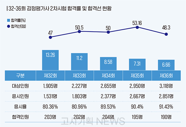 À̹ø 2Â÷½ÃÇèÀÇ ÃÑ ´ë»óÀÚ´Â 3õ118¸íÀ¸·Î ÀÌÁß 267¸íÀÌ °á½ÃÇϰí 2õ851¸íÀÌ ÀÀ½ÃÇß´Ù. ÀÀ½ÃÀ²Àº 91.43%´Ù. ÇÕ°ÝÀÚ´Â 190¸íÀ̸ç ÀÀ½ÃÀÚ ¼ö ´ëºñ 6.66%¿¡ ´ÞÇÑ´Ù. Æò±Õ Çհݼ±Àº 48.33Á¡ÀÌ´Ù. ÀÌ´Â Áö³ÇØ Çհݼ±ÀÎ 53.16Á¡º¸´Ù Ç϶ôÇß´Ù.