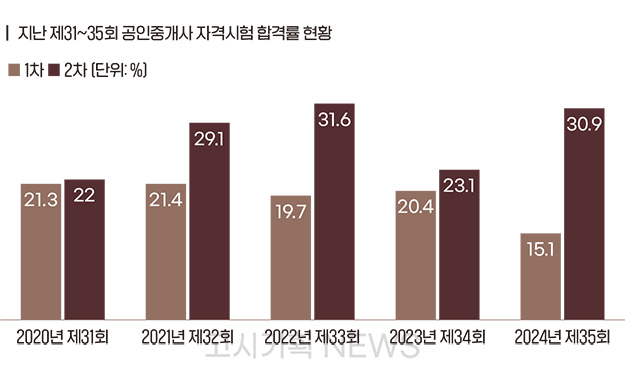 2020³â Á¦31ȸ ½ÃÇèºÎÅÍ 2024³â Á¦35ȸ ½ÃÇè±îÁö ÇÕ°Ý·üÀ» »ìÆìº¸¸é ¡ã1Â÷ 21.3%¡æ21.4%¡æ 19.7%¡æ20.4%¡æ15.1% ¡ã2Â÷ 22%¡æ29.1%¡æ31.6%¡æ23.1%¡æ 30.9%·Î ³ªÅ¸³µ´Ù.
