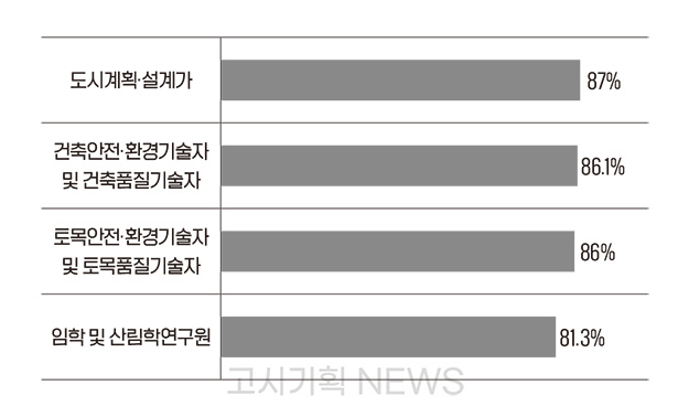 Çѱ¹°í¿ëÁ¤º¸¿øÀÇ ÀçÁ÷ÀÚ Á¶»ç ÀÚ·á¿¡ µû¸£¸é Á¶°æ±â¼úÀÚ¿Í Á÷¹« À¯»ç¼ºÀÌ ³ôÀº Á÷¾÷¿¡´Â ¡ãµµ½Ã°èȹ¡¤¼³°è°¡ 87% ¡ã°ÇÃà¾ÈÀü¡¤È¯°æ±â¼úÀÚ ¹× °ÇÃàǰÁú±â¼úÀÚ 86.1% ¡ãÅä¸ñ¾ÈÀü¡¤È¯°æ±â¼úÀÚ ¹× Åä¸ñǰÁú±â¼úÀÚ 86% ¡ãÀÓÇÐ ¹× »ê¸²Çבּ¸¿ø 81.5% µîÀÌ ÀÖ´Ù.