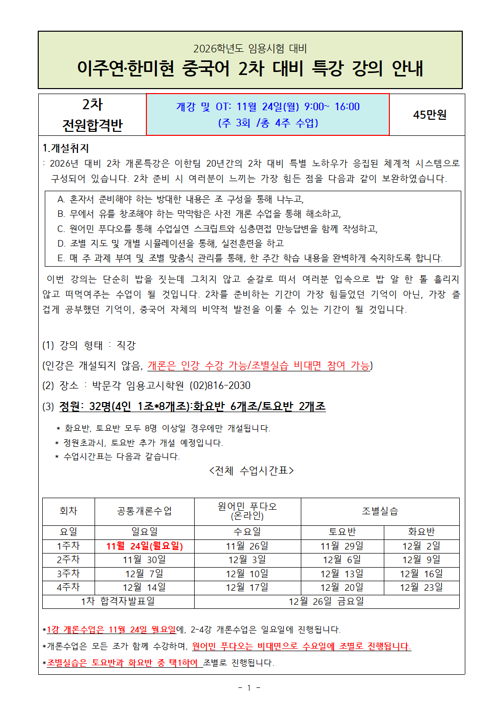 | Á¦¸ñ : [ÀÌÇÑÆÀ Áß±¹¾î] 2Â÷ ´ëºñ Ư° °ÀǾȳ»(Á÷°) |
