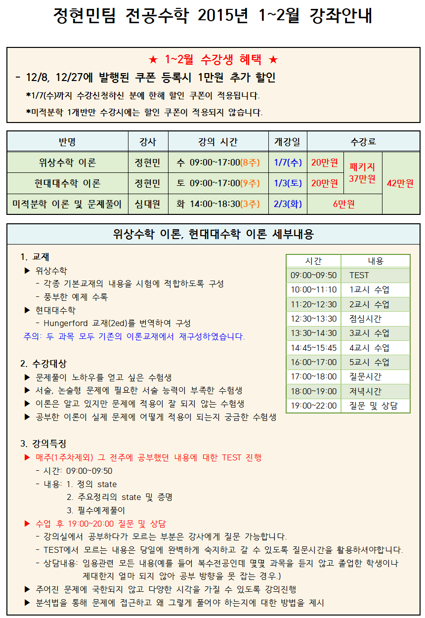 | Á¦¸ñ : [Á¤Çö¹Î ¼öÇÐÆÀ] 2015³â 1~2¿ù °ÀÇ ¹× ¿¬°£°ÀÇ ¾È³»! |