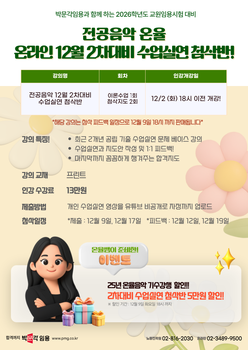 | Á¦¸ñ : [¿ÂÀ² Àü°øÀ½¾Ç] 2025³â 12¿ù 2Â÷´ëºñ ¼ö¾÷½Ç¿¬ ÷»è¹Ý[÷»è2ȸ] ¾È³»! |